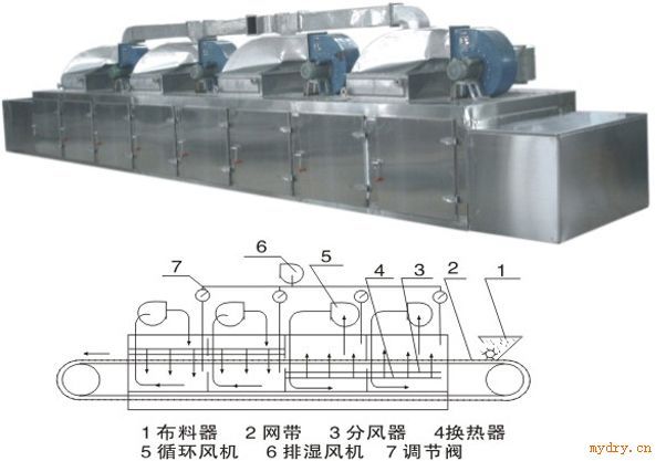DW series multi belt dryer is the continuous drying equipment used for ventilating, sheet, strip, good dry granular materials for water, dehydrated vegetables, catalyst, medicine class rate is high, and the high temperature is not allowed particularly suitable for the materials; the dryer has the advantages of fast drying, evaporation high strength, good product quality, paste material of dehydrated cake, the granulation or strip made before drying.