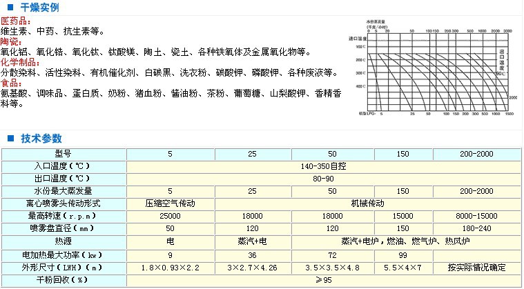 干燥速度快,料液經霧化后表面積大大增加,在熱風氣流中,瞬間就可蒸發95%-98%的水份,完成干燥時間僅需數秒鐘,特別適用于熱敏性物料的干燥。所有產品具有良好的均勻度、流動性和溶解性,產品純度高,質量好。操作簡單穩定,調節控制方便,容易實現自動化作業。生產過程簡化,適宜連續控制生產含濕量40%-90%的液體,一次干燥成粉,減少粉碎篩選等工序,操作環境衛生條件優越,能避免干燥過程中的粉塵飛揚。干燥回收率大于95%。