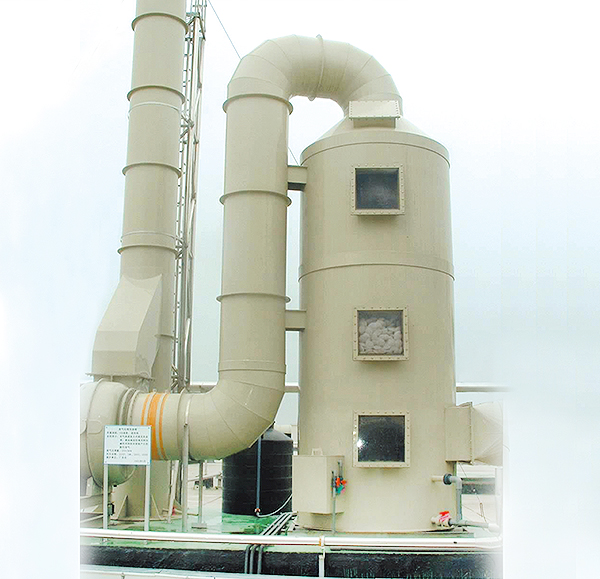 • 噴淋廢氣處理塔分單塔體和雙塔體。采用圓形塔體,用法蘭分段連接而成。具體由貯液箱、塔體、進風段、噴淋層、填料層、旋流除霧層、出風錐帽、觀檢孔等組成。